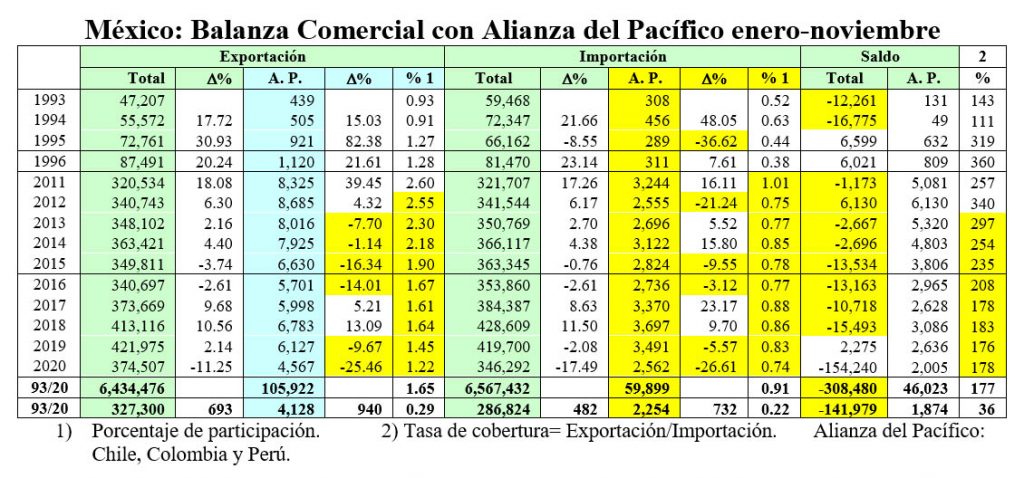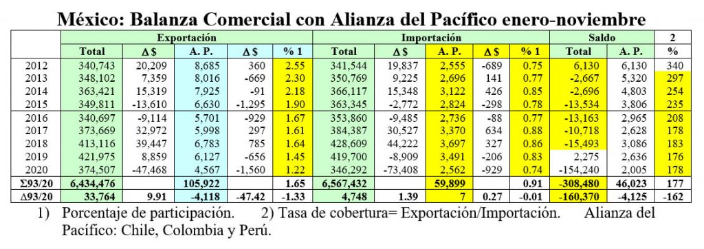 Para el período 2012-2020 en que ha estado en vigor el acuerdo de la Alianza del Pacífico, el incremento de las importaciones fue de sólo 7 millones USD, sin embargo, se puede señalar que las distancias y diferencias de las cifras de comercio exterior de México con esos países se han venido acortando, fundamentalmente, por la reducción de las exportaciones mexicanas a esos países.