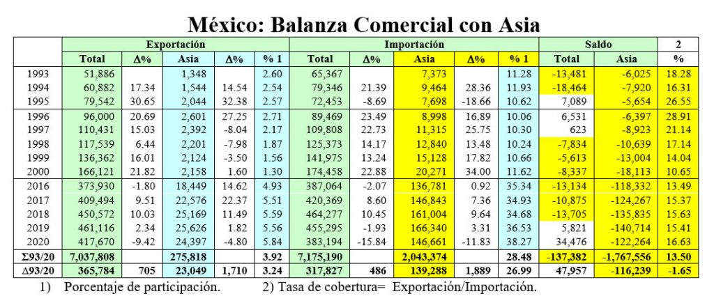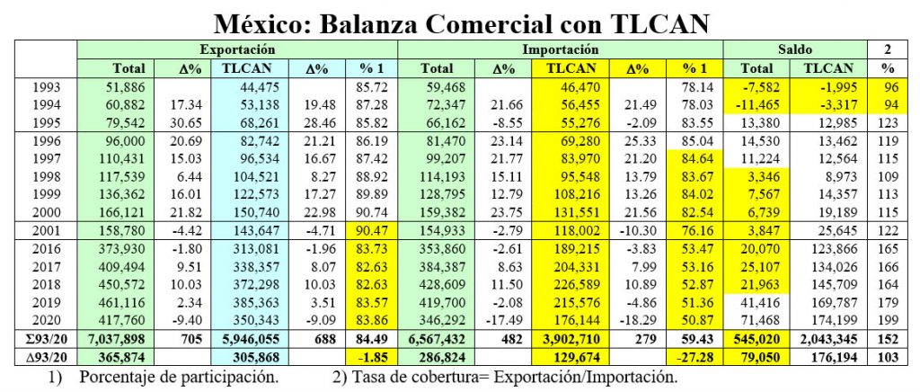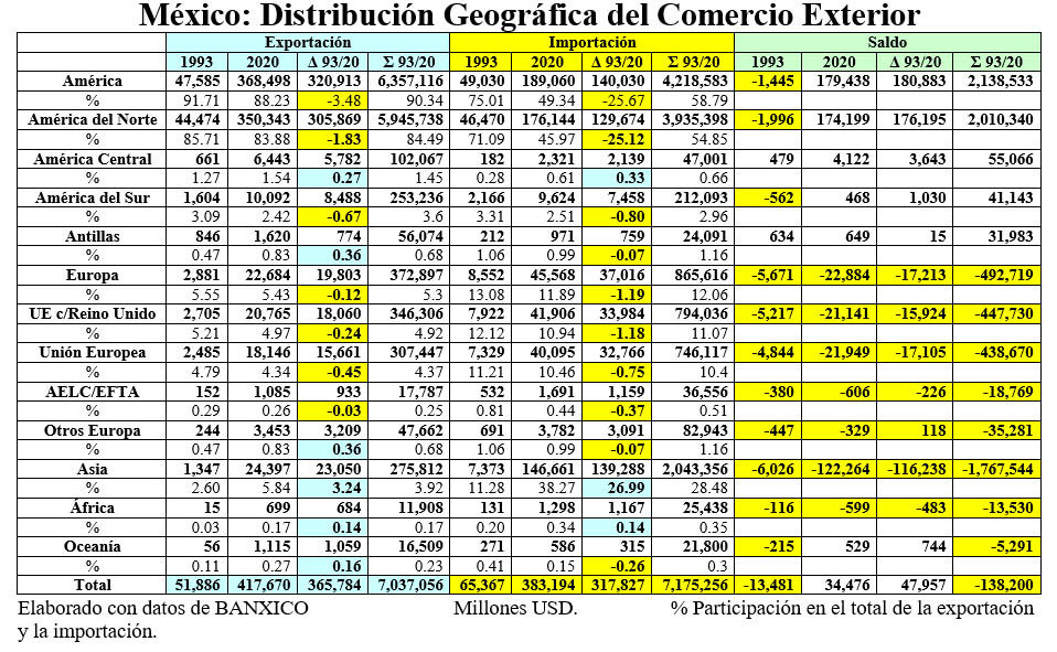 A continuación, presento un cuadro estadístico sobre la evolución geográfica del comercio exterior mexicano, en el período 1993-2020, mismo en el que podemos ver, de manera general, la pérdida de participación de los países con los que hemos firmado TLC’s en nuestro comercio exterior, tanto de exportación, así como de importación –lo que he marcado en amarillo–.