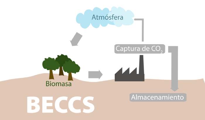Finalmente, la bioenergía con captura y almacenamiento de carbono o BECCS por sus siglas en inglés, también es un proceso de geoingeniería, si se considera que se interviene la forma de cultivo y uso de la tierra y que también requiere almacenamiento de CO2 en el subsuelo. Consiste en la plantación de árboles, productos agrícolas u otros cultivos (preferiblemente de crecimiento rápido) para generar energía. Esta es la base para que se produzca una captura de CO2 a medida que esta vegetación crece, a la vez que genera actividades productivas (madera, productos agrícolas, entre otros). Los desechos de estas actividades se utilizan para producir bioenergía lo que inevitablemente requiere combustión. Este proceso generará emisiones que incluyen CO2, el cual a través de un proceso químico se separará de las demás emisiones y finalmente en estado puro se almacenará en lugares geológicamente seguros. Nuevamente, este tipo de actividades puede terminar en un “mal uso” del CO2 capturado, a lo cual hay que agregar el riesgo de grandes transformaciones del uso de tierras que puede poner en peligro la biodiversidad, el desplazamiento de población, e incluso generar mayores emisiones debido al cambio en el uso de suelos. El IPCC (2019) calcula que para 2100 entre 25 y 46% de la tierra cultivable tendría que dedicarse a esta actividad dentro del marco de BECCS y aun así no sería necesariamente consistente con alcanzar la elevación máxima de temperatura a los 1.5ºC.