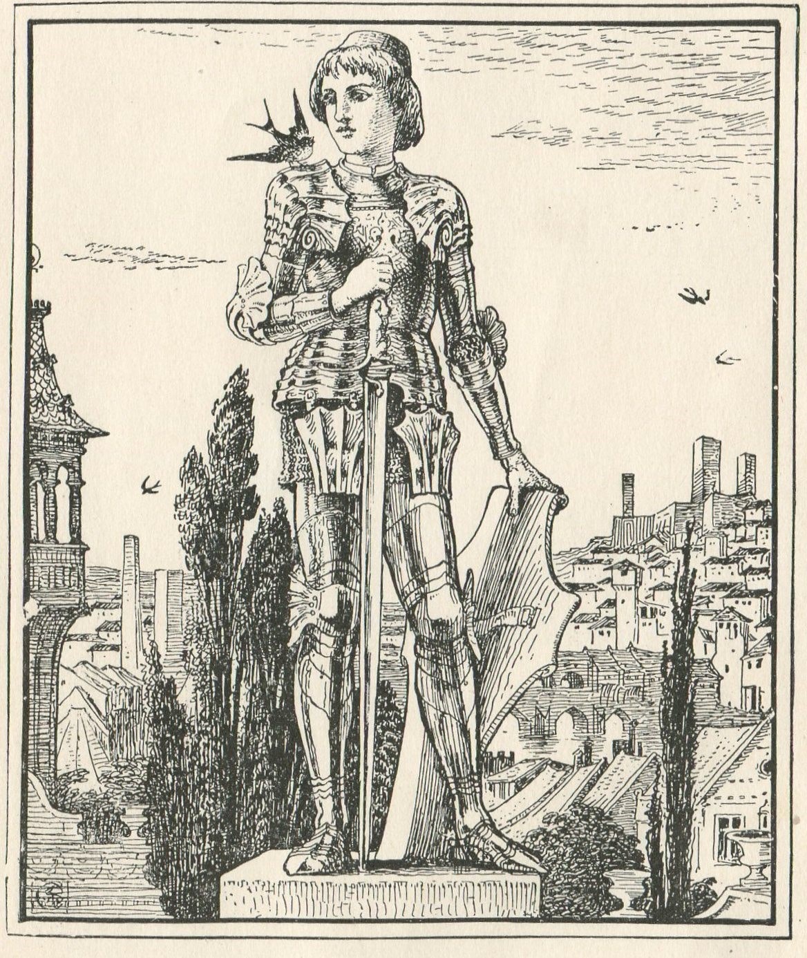 Ilustración de “El prínicpe feliz” cuento de Oscar Wilde sobre una estatua que, con ayuda y sacrificio de una golondrina, se desembaraza de todos sus aditamentos de valor para ayudar a gente del pueblo en desgracia, lo cual termina en su demolición (Imagen tomada de https://visperasdenada.files.wordpress.com/2013/03/el-principe-feliz.jpg).