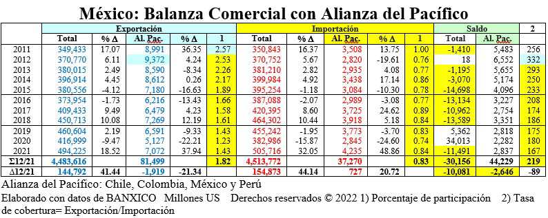 Por el contrario, las importaciones procedentes del bloque muestran un crecimiento sostenido que pasó de 2,820 millones US en 2012, a 4,235 millones US en 2021. Como consecuencia, en los 10 años de operación, nuestra exportación descendió -1,919 millones US, en tanto que la importación se incrementó 727 millones US. Al mismo tiempo, la tasa de cobertura descendió de 332% a sólo 167%