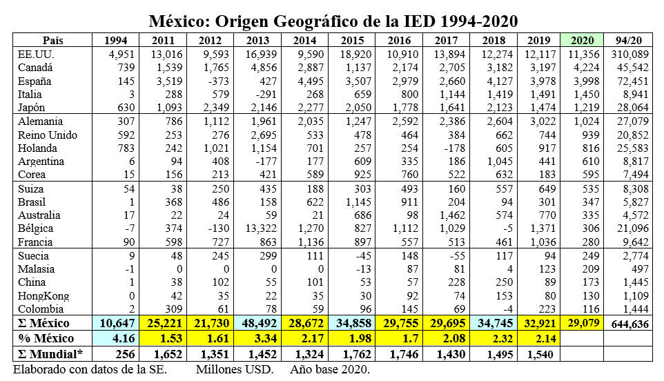 Así, en este período, descendimos de la 4ª a la 16ª posición mundial, a pesar de que uno de los objetivos de México al firmar el TLCAN era incrementar la captación de estos flujos, especialmente, porque la principal fuente generadora de IED mundial es Estados Unidos, nuestro socio en este proceso de integración, junto con Canadá.