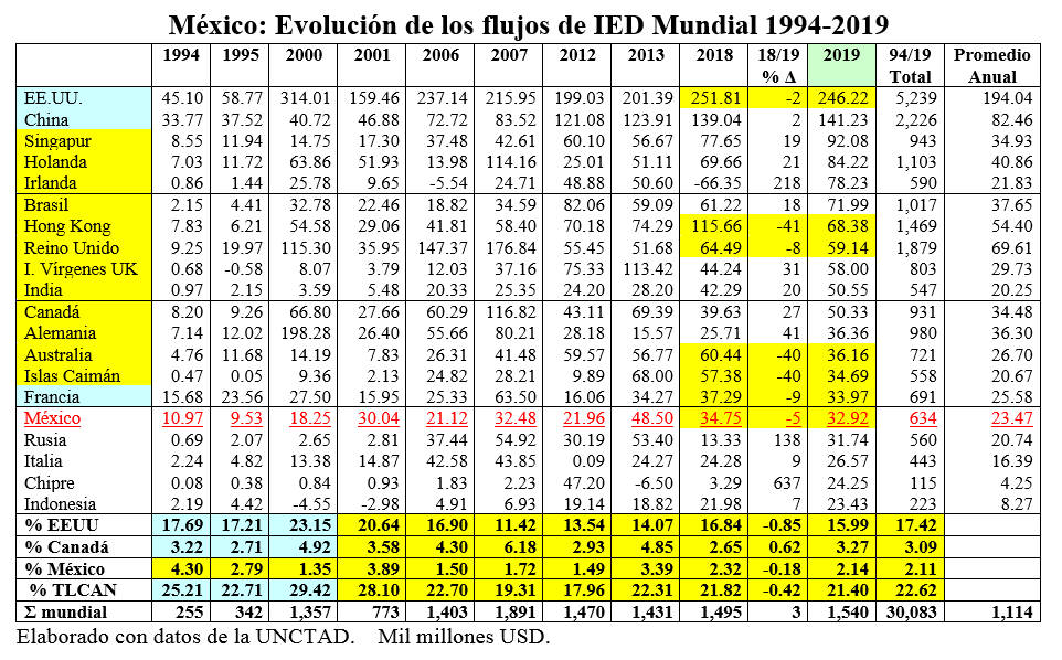 Tomando como base al año 2019, podemos ver que el porcentaje de captación de flujos de IED en el período 1994-2019 ha sido decreciente, pues si bien en el año 1994 captamos el 4.3% del total mundial, sólo superados por Estados Unidos, China y Francia, para el año 2019 el porcentaje se redujo a 2.14%.