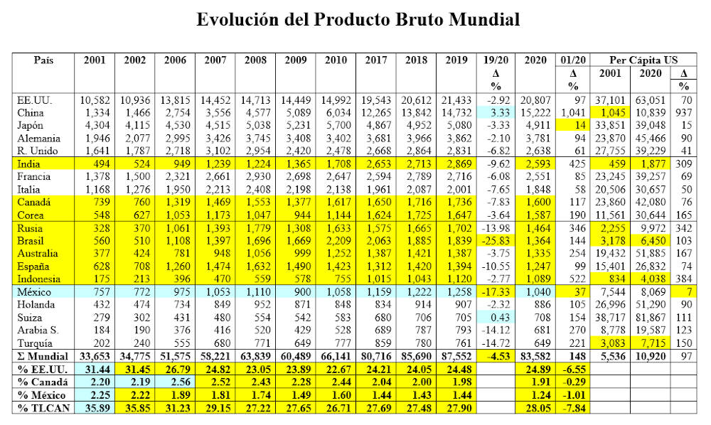 En el cuadro siguiente he marcado con amarillo los países que nos han superado como potencia económica en este período, debiendo señalar que, de los 20 principales países, en el año 2001, un total de 14 de ellos registraban un PIB Per Cápita superior al nuestro y que, para el 2020 ya son 16, pues China y Rusia nos rebasaron; y que si en el año 2001 nuestro PIB Per Cápita se ubicaba 36% por arriba del promedio mundial, para el año 2020 caímos estruendosamente, situándonos -26% debajo y la ubicación en el ranking mundial descendimos 29 escalones al caer del 47º al 76º lugar.