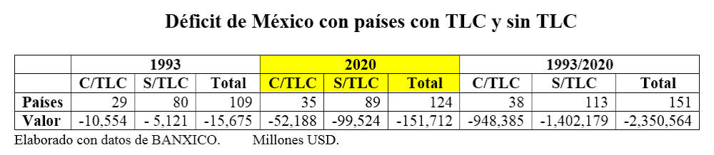 Por esta circunstancia, México presenta un déficit creciente en valor y con mayor número de países con los que ha firmado un TLC, así como también con los que no los ha firmado, mismo que en el período 1993-2020 equivale al 226% del PIB Total de México en el año 2020.