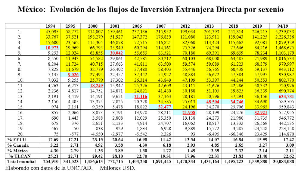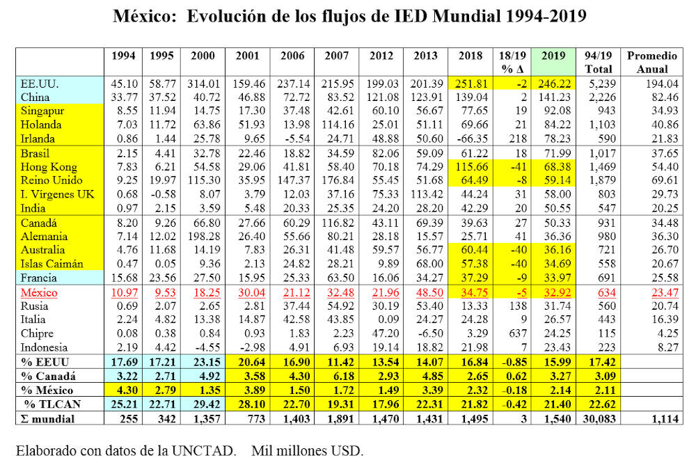 Así, en este período 1994-2019, descendimos de la 4ª a la 16ª posición mundial como destino preferido de la IED Mundial, a pesar de que uno de los objetivos de México al firmar el TLCAN era incrementar la captación de estos flujos, especialmente, porque la principal fuente generadora de IED mundial es EE.UU., nuestro socio en este proceso de integración junto con Canadá.