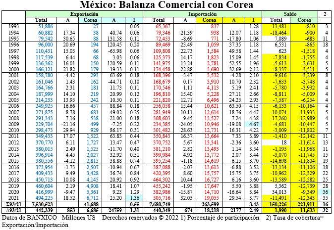 El embajador mexicano, cuando habla del crecimiento del comercio bilateral, no toma en cuenta la estructura del comercio exterior de México, ni la evolución histórica del intercambio con Corea pues, cuando habla de que México es el tercer socio comercial de México, omite la dimensión y detalles del desarrollo de los intercambios con ese país mismo que, si en el año 1993, México exportó 27 millones US, para el año 2021 fue de 6,712 millones US, en tanto que las importaciones pasaron de 837 a 19,055 millones US, situación que se traduce en un déficit creciente que pasó de 810 a -12,343 millones US, con un déficit acumulado de -221,911 millones US para dicho periodo.