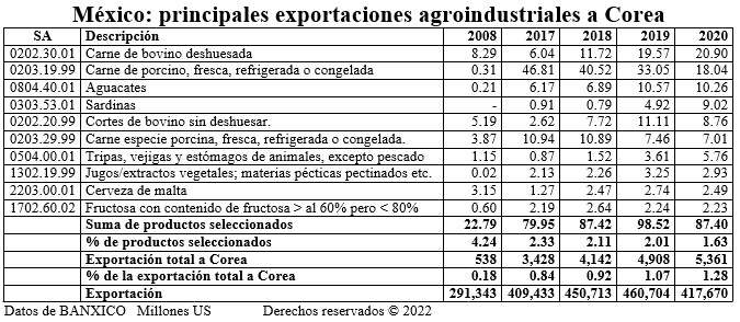 Así mismo, hay que señalar que, su insistencia en la ganancia que México obtendría con la exportación de productos agroindustriales con un TLC, está fuera de contexto pues, de los 100 principales productos que nuestro país exporta a Corea, solamente 10 corresponden a este sector; también reitera que estos productos pagan aranceles altos, sin embargo, hay que hacer notar que, en términos generales, son productos de consumo necesario que naturalmente seguirán importando a pesar de los aranceles altos y que, en el año 2020, los productos agrícolas solo constituyeron el 1.63% de la exportación mexicana con ese destino y, para el 2021, con cifras preliminares, fue de solo el 1.3%.