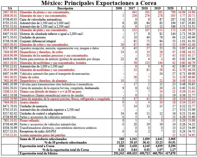 La exportación mexicana a Corea, en su mayor parte, está constituida por productos con reducido valor agregado entre los cuales ocupan el primer y segundo lugar, los minerales de plomo y minerales de zinc, que absorben el 20.71% del total. Demás productos netamente mexicanos son otros minerales, desperdicios de cobre y aluminio, carne de bovino y porcino, marcados con rojo en el cuadro siguiente; y el resto de la exportación está constituida por partes automotrices, electrónicas etc., que son objeto de comercio intrafirma, mayormente de empresas coreanas radicadas en nuestro territorio.