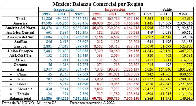 A continuación, incluyo un resumen de nuestra balanza comercial con los principales bloques regionales en donde se puede ver que, en el periodo 1993/2021, sólo tuvimos superávit con América del Norte y otras subregiones del continente debido a que, la “estrategia” diseñada por los funcionarios mexicanos está basada en importar temporalmente de otros orígenes para meramente ensamblar en nuestro territorio, y reexportar a Canadá y EEUU, con reducido valor agregado.