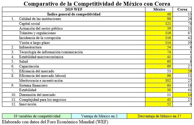 Así mismo, el embajador Figueroa Fischer omite decir que este enorme desbalance es originado por la nula competitividad del marco sistémico mexicano frente al de Corea pues, de las 19 variables que la miden, México sólo presenta ventaja en dos y una enorme desventaja en 17 de ellas, según se puede ver en el cuadro comparativo que elaboré con datos del Foro Económico Mundial (WEF), debiendo hacer la salvedad de que, aunque tenemos ventaja en la dimensión del mercado porque, en el año 2021, había 128 millones de mexicanos y sólo 52 millones de coreanos, nuestro nivel de ingresos y consumo era de 9,967 US, en tanto que el coreano ascendía a 35,196 US, es decir, el ingreso mexicano correspondió a 28% del coreano o, si lo prefieren, el ingreso coreano correspondió a un 253% del nuestro.