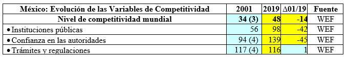 Importante es destacar que, el bajo nivel de competitividad, de acuerdo con el Foro Económico mundial (WEF), tiene su origen en la pésima calidad de las instituciones públicas y de sus funcionarios, situación que incide negativamente en los engorrosos trámites y regulaciones que tiene que enfrentar el empresariado mexicano pues, aunque su planta sea muy productiva, se topa con un marco sistémico deficiente y caro, además de que, por su baja calidad, las instituciones y sus funcionarios son incapaces de definir una estrategia, con programas, proyectos y políticas públicas realistas que incidan positivamente en el desarrollo del país.