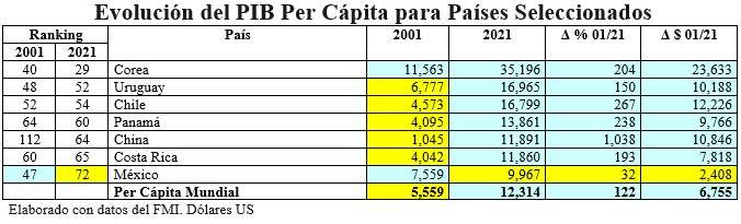 Al respecto, incluyo un cuadro comparativo con 6 países que resultan emblemáticos y ejemplares para México pues, en ese periodo nos han superado y, México, se sitúa en el último lugar en valor, en incremento del valor y en incremento porcentual del valor.