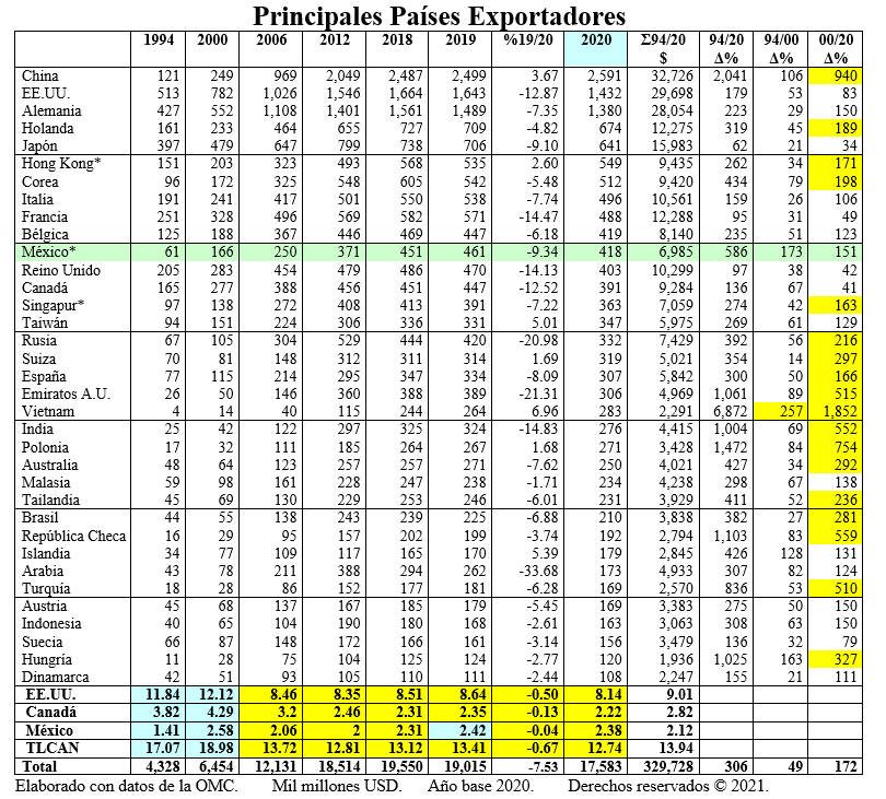 Para el período 1994-2020, China se presenta como el principal país exportador con 32.72 billones USD; Estados Unidos en segundo lugar con 29.69 billones, seguido de Alemania con 28.05; Japón 15.98; Francia con 12.28. Singapur en 14º lugar con 7.05%; y México en el 15º con 6.98 billones USD.