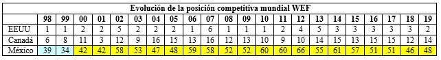 - ● Así mismo, en el estudio más reciente del Foro Económico Mundial (WEF), correspondiente al año 2019, se señala que, mientras EE.UU. aparece como el 2º país más competitivo del mundo, Canadá se ubica en el 14º, en tanto que México, en un lejano 48º lugar. Esto nos dice que, el único país que no es competitivo, en la región de América del Norte, es México.