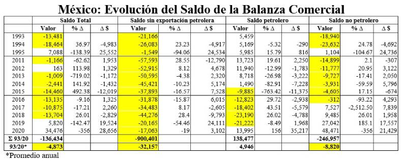 La realidad lo demuestra pues, los retrocesos de México, en los 20 años más recientes, son deplorables, mismos que he marcado con amarillo en el cuadro que incluyo a continuación y que nos hablan de la desindustrialización de México y de la desintegración comercial y productiva con sus socios más cercanos e importantes a nivel mundial.