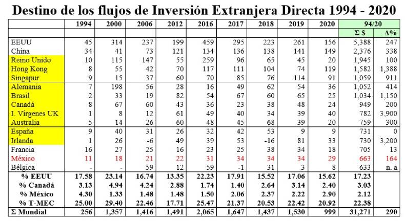 Por eso, la decreciente corriente de flujos de IED mundial hacia México, misma que cayó de 4.3% en 1994, a 2.9% en 2020, periodo en el porcentaje acumulado fue de sólo 2.12% y en el que fuimos superados por Reino Unido, Hong Kong. Singapur, Alemania, Brasil, Canadá, Islas Vírgenes UK, Australia, España e Irlanda como países más atractivos.