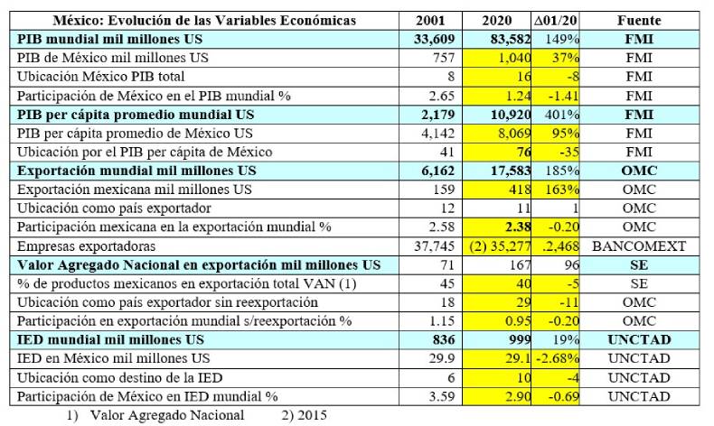 El simple hecho de que México haya caído de la 8ª a la 16ª posición como economía mundial en este periodo, y de que nuestra participación en la generación de riqueza mundial haya retrocedido del 2.65% que ostentaba en 2001, a 1.24% en 2020, nos lo dice todo.
