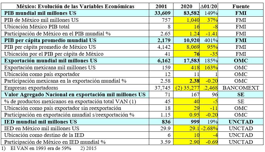 Durante el periodo 2001/2020 en que, prácticamente, han estado en vigor los TLC’s con 54 países y los 33 APPRIS, el proceso de desindustrialización de México ha sido terrible y, la caída como potencia económica mundial y el ingreso per cápita de sus habitantes, ha sido estrepitosa.