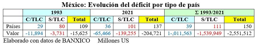 En dicho resumen, también incluyo información sobre los países con los que no hemos firmado un TLC, y con los que registramos un enorme déficit, cifra que abarca a 111 países con 1,539,949 millones US, para alcanzar un gran total de 150 países con los que se arroja un saldo negativo por 2,551,512 millones US, en el periodo 1993/2021, equivalente al 198% del PIB Total de México en el año 2021.