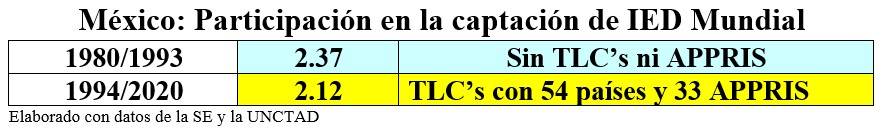 Lo sorprendente y paradójico es que, en el periodo 1980/1993, durante el cual no teníamos TLC o APPRI alguno, el porcentaje de captación de IED Mundial fue superior al de 1994/2020 en que, prácticamente, ya estaban en vigor todos los TLC’s con 54 países y los 33 APPRI’s que nuestros funcionarios firmaron, supuestamente, con el objetivo de captar mayores flujos de Inversión Extranjera Mundial.