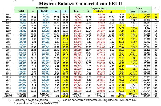 Estados Unidos es el principal socio comercial de México pues, en 2021, el 80.69% de las exportaciones mexicanas se dirigió hacia ese mercado, aunque sólo el 43.70% de las importaciones provino del mismo.