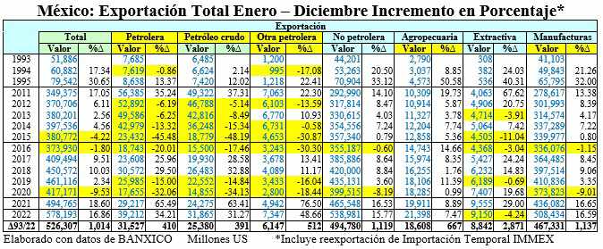 A continuación, me es grato enviar información estadística sobre la balanza comercial de México, para el periodo 1993 – 2022, de la cual cabe destacar que, en 2022, la Exportación Total fue de 578.193 millones US, con un incremento de 16.86% en relación con el año 2021, equivalente a 83,428 millones US.