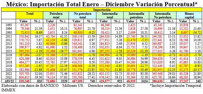 La Importación Total fue de 604,615 millones US, con un incremento de 19.56% y 98,912 millones US, de tal manera que el saldo fue deficitario por un total de -26,422 millones US, el más elevado del periodo 1993 – 2022, mismo en que el déficit acumulado alcanzó la cifra de -174,561 millones US.