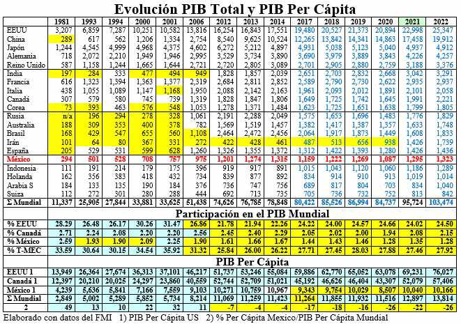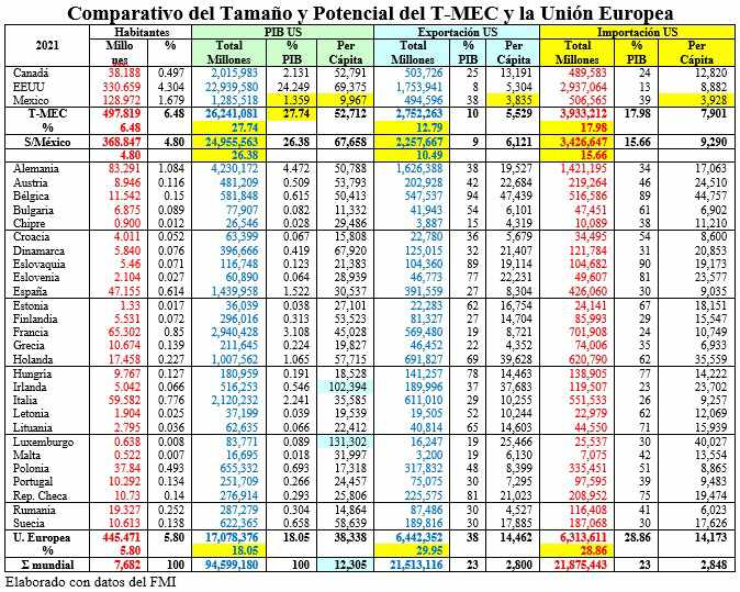 Esto se puede ver de una manera más grafica en el cuadro comparativo de las principales variables económicas de México con sus socios del TLCAN y de la Unión Europea, del cual destaca que, en el año 2021, la población mexicana representó el 1.679% de la población mundial, pero, sólo produjo el 1.359% del PIB Total Mundial, por lo que, penosa y deprimentemente, ocupamos el último lugar en ingreso, importación y exportación per cápita del universo de países que integran los dos bloques.