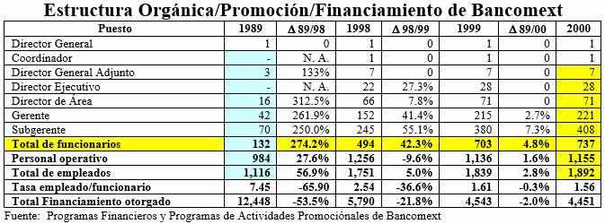 Además, en el caso de BANCOMEXT, el deterioro estructural y de sus funciones fue terrible pues, en el periodo 1989 – 2000, el número de funcionarios, mayormente recomendados y sin conocimientos del comercio exterior, pasó de 132 a 737, lo que generó la atomización de sus funciones y fragmentó la toma de decisiones. Esto redujo, aún más, la posibilidad de establecer programas bien concatenados en detrimento de un proyecto realista de comercio exterior en beneficio de nuestro país.