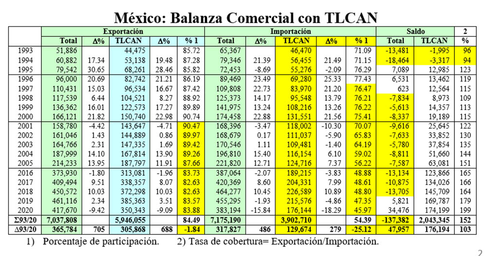 Así, la participación de Canadá y Estados Unidos como proveedores de México cayó de 77.42% en 1996, a 45.97% en 2020 y, aunque el porcentaje de nuestra exportación al TLCAN se mantuvo en un nivel superior a 80% en el período 1993-2020, ha sido fundamentalmente por la enorme importación temporal de insumos que realizamos de otras regiones, principalmente de Asia, y de China en particular, para ser reexportados con reducido valor agregado en nuestro territorio.