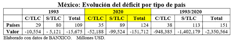Como consecuencia, se cayó en un proceso de simulación y, erróneamente, se buscó firmar TLC´s con otros 52 países, desvirtuando el objetivo original de integración regional por el concepto de cadenas de valor, mismo que se tradujo en una atomización de nuestras reducidas fortalezas. De tal manera que, del total de 54 países con los que hemos firmado TLC’s, el número con los que registramos un déficit ha sido creciente, mismo que pasó de 29 en 1993, con un déficit de -10,554 millones USD, a 35 en 2020, por un total de -52,188 millones USD.