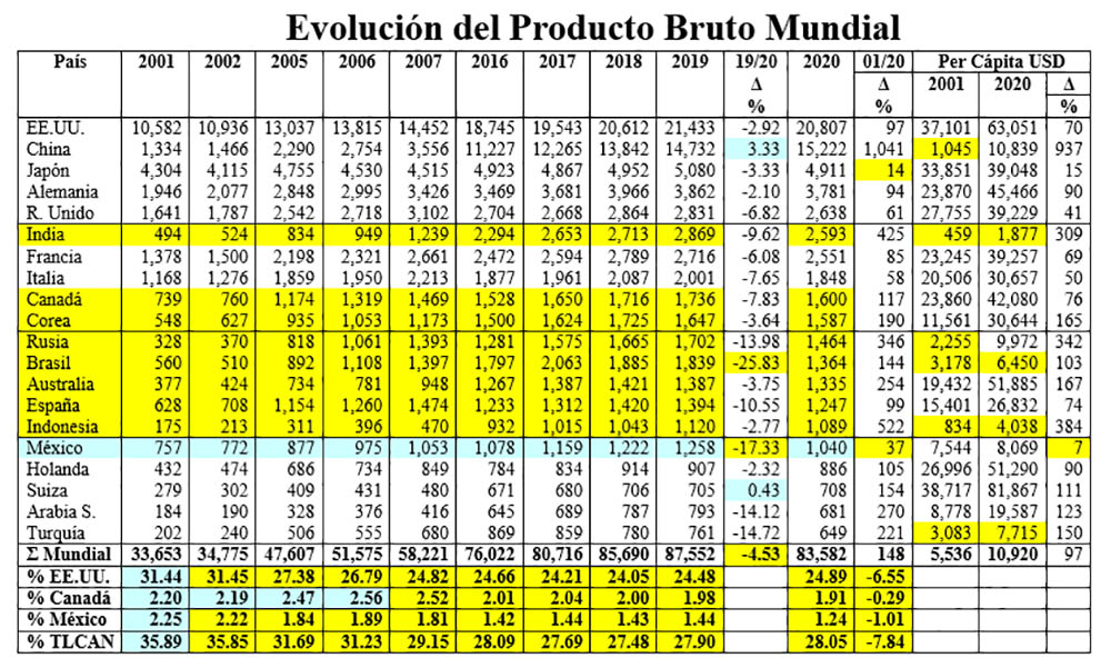 Desgraciadamente, México es el gran perdedor del grupo, ya que en el período 2001-2016, sus principales variables económicas registraron retrocesos, lo que se manifiesta de una manera muy cruda en su caída como economía mundial al pasar de la 8ª a la 15ª posición en el período 2001-2019; situación que ha culminado, en el año 2020, con la caída del PIB Total de México hasta el 16º lugar, debido a que en estos 19 años perdió 1.01% de participación en generación de riqueza mundial.