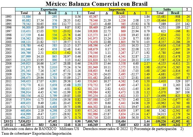 Las importaciones procedentes de Brasil, aunque presentan algunos altibajo anuales, muestran una tendencia creciente ya que pasaron de 1,201 millones US, en 1993, a 8,806 millones US en 2021.