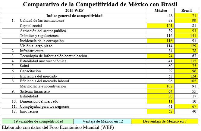 Los resultados de la balanza con Brasil pudieran parecer contradictorios si tomamos en cuenta el nivel de competitividad de ambos países pues en el año 2019, Brasil se ubicó en la 71ª posición mundial, en tanto que, México, en el 48º, debido a que, de los 19 elementos que la miden, México tiene ventaja en un total de 12 y, desventaja, en 7.