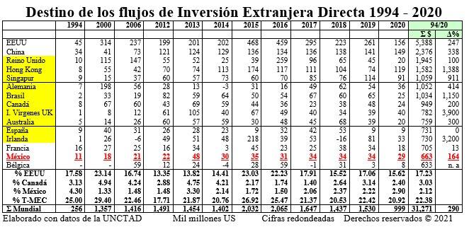 Para el periodo completo, nuestra caída fue peor pues, descendimos hasta la 14ª posición al ser superados por los países marcados con amarillo en el siguiente cuadro, mismo en el cual México aparece con un crecimiento de captación de flujos de 164%, el tercer peor nivel de crecimiento de los 15 principales países, a pesar de ser los vecinos más próximos de la principal fuente de generación de IED mundial: Canadá y EEUU, con los que firmamos el primer TLC.