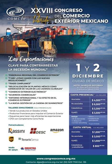 El XXVIII Congreso del Comercio Exterior Mexicano tendrá lugar en el Hotel Marquís Reforma, de la ciudad de México, los días 1 y 2 de diciembre próximo.