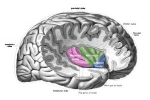 El lóbulo de la ínsula de la corteza cerebral está situado en la profundidad de la fisura de Silvio y es visible al separar o seccionar el lóbulo frontal y temporal del cerebro, como en este diagrama. Tiene un papel central en la interocepción. (Figura de Craig, tomada de Wikipedia).